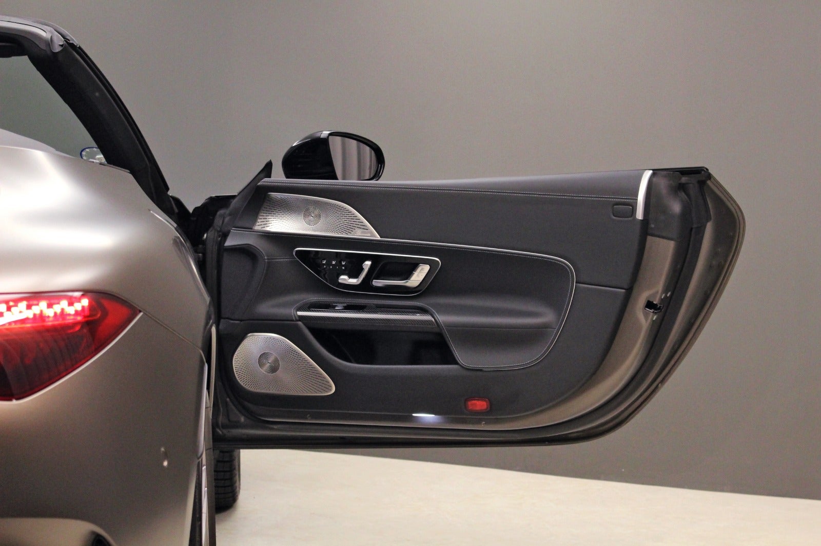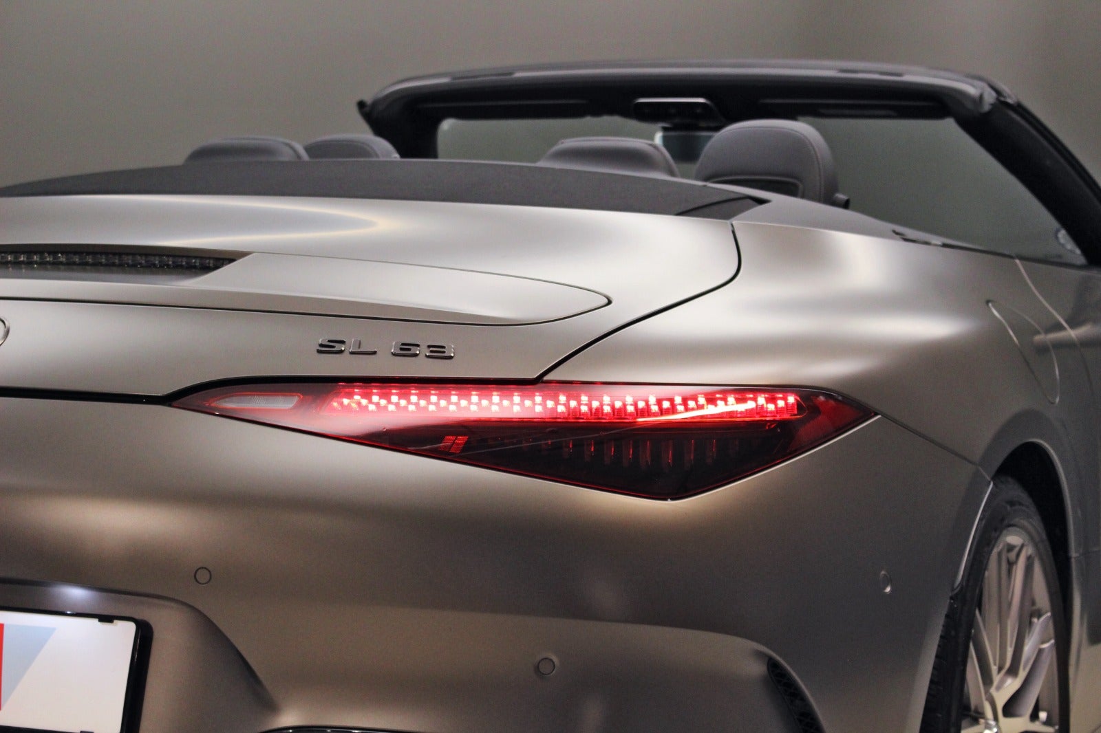 Mercedes-Benz SL63 4,0 AMG Roadster (585 HK) aut. 4Matic+ 2d, i farven Monzagrå magno med sort/antracit kompletlæder kabine.